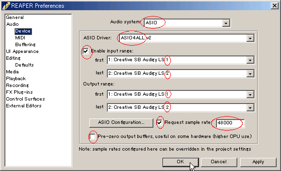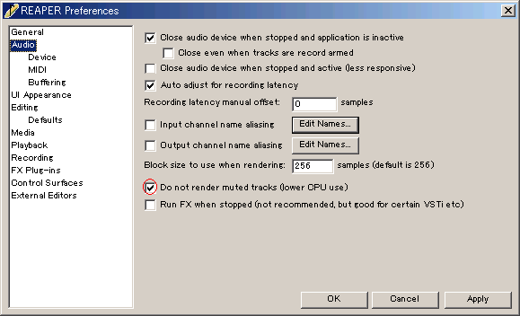 一部Reaperの再起動が必要な設定もあるので、とりあえずここまででReaperをいったん終了しよう。設定の意味を知りたい人はReaper付属のヘルプやローコスト制作のREAPERのページをどーぞ。