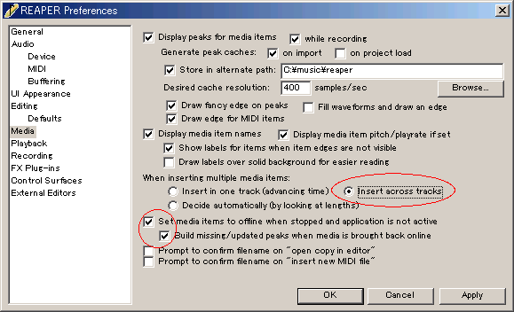 作業を始める前に「C:\Documents and Settings\ユーザー名\Application Data\REAPER」(斜体の部分には自分のユーザー名を入れる)にある「REAPER.ini」をバックアップしておこう。Reaperの設定はほとんどこのファイルに書き込まれるので、わけがわからなくなったら古いファイルで上書きすれば元に戻る。