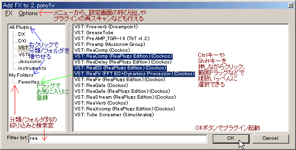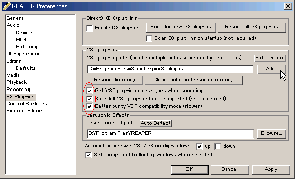 「add...」ボタンを押して「自分がVSTプラグインを保存しているフォルダ」を選び、最後にOKボタン。外部エディタを使わない(Reaperだけで作業する)なら設定はこれで終わり。