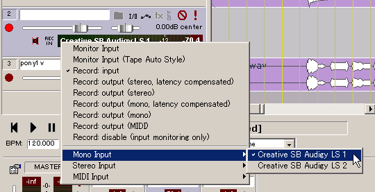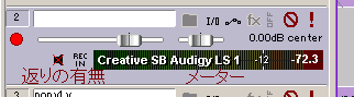 メーターを右クリックして、マイク録音の場合モノラルインプットの1番を選ぶ。上図の「Creative SB Audigy LS」というのは、筆者が使っているサウンドカードの製品名(なので、それぞれの環境で名前が違う:Audioの枝にある「device」で設定したのと同じモノ)。