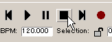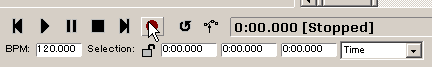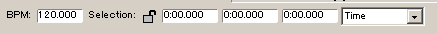BPM=現在のテンポ(数字記入可)、選択範囲のロックボタン、選択範囲の開始位置、選択範囲の終了位置、選択範囲の長さ、選択範囲の表示形式(時間/小節)。