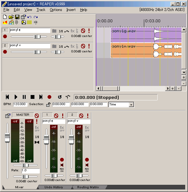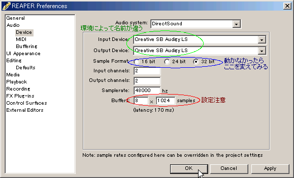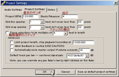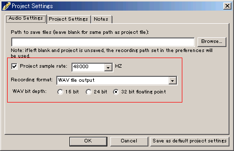 再生や録音の速度で問題が出る場合、Altキー+Enterキーで「Project sample rate」をパソコン(またはサウンドカード)がネイティブ対応しているもの(機種によるが、たいてい48000か96000)に合わせよう。