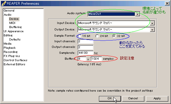 DirectSoundでも問題がある場合はWaveOut(MME)を使う。もしかしたら環境によって名前が違うかもしれない(よく覚えていない)。