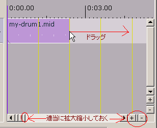 音源を立ち上げてテンポ(BPM)を設定したReaperに今書き出したMIDIファイルを読ませて音が出ることを確認したら、アイテムの右端をドラッグ。