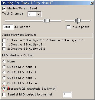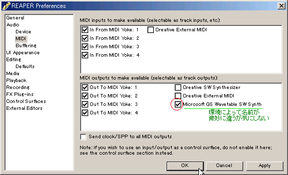 普通にMIDI演奏ができる音源なら何でもよいのだが、ここではとりあえずMicrosoft GS Wavetable Synth(略称MSGS、旧称Microsoft GS Wavetable SW Synth、DirectX用バージョンのMicrosoft Synthesizerもある:すべてローランド製)にしておく。もしMSGSが音声出力と競合する場合は、上記に加え音声出力をDirectSoundなどに変更する。
