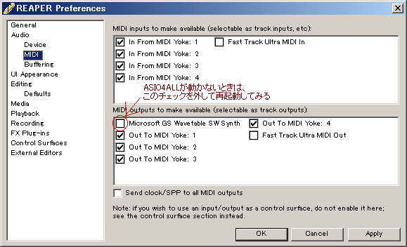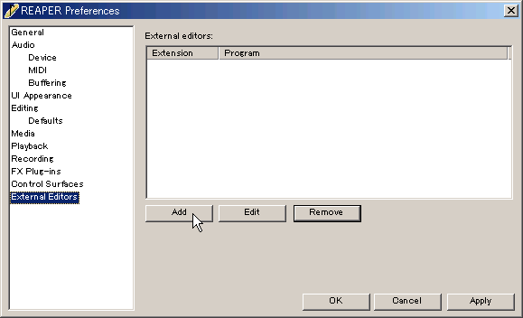 もしReaperと外部シンセが音声I/O(入出力)を奪い合ってトラブルを起こすようなら、次の項を参照してサウンドドライバを変更する。また、MIDIファイルの編集も外部エディタでやった方がラクなので、設定をしておくとよい。