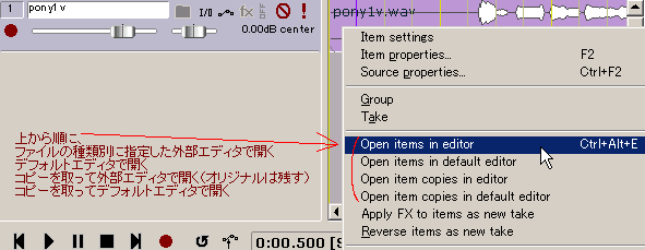 外部エディタの呼び出しはアイテムを右クリックして行う。コピーしてからの編集は、古い元ファイルをReaperの中に残したままコピーだけ編集するモード。