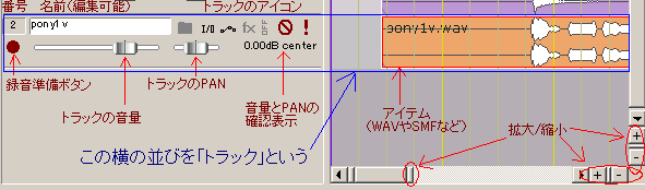 トラックというのは「同時再生する音の単位」で、CDやカセットテープは2トラック(右の音と左の音)しかないが、Reaperはマルチトラックなので10も20も使うことができるし、左右のバランス(PAN)も自分の好みで決められる。
