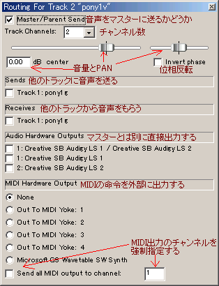 チャンネル数の設定もあるが、これはかなり凝ったことをやるのでなければ使わない。たとえばSoftDrumのようなマルチチャンネル音源からの出力を複数のトラックに切り分けるとか、イフェクタプラグインを立ち上げてドライシグナルとウェットシグナルを別のトラック(またはバス)に送るとか、そういった場合に使う。