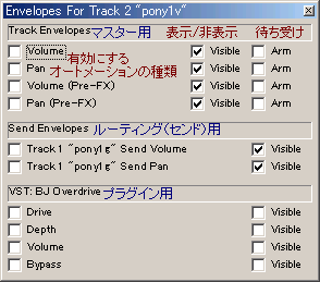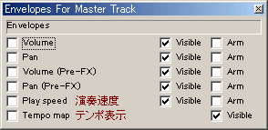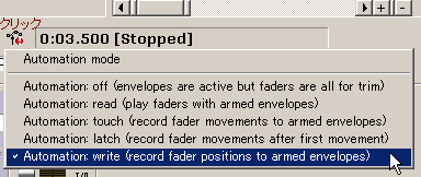 もし他のトラックに音を送る設定ならマスターとは別に操作できるし、プラグインを立ち上げている場合はそのパラメータもオートメーションの対象になる。Pre-Fxと書いてあるのは「イフェクトをかける前の」という意味。項目を有効にして表示モードにして待ち受けもオンにした状態で、オートメーションモードのアイコン(後述)をクリックしてWriteモードにすると、