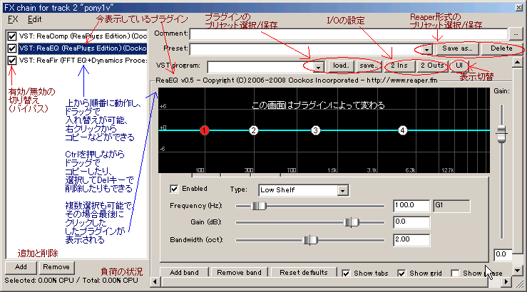 VSTHostがバージョン1.51で安定したので、Domino+Audacity+Reaper+VSTHost(Legree)という構成が広くオススメできるものになった(Audacityは1.2x系と1.3x系がかなり別物というか、波形編集ソフトとしては1.2.6でほぼ完成した形なので、とくに理由がないなら1.2.6を使うのが便利だと思う:1.3系で追加された機能は、単体運用なら便利かもしれないが、上記のような構成ならムリにAudacity上で使う必要がないものが多い)。Legreeを介したReaperとVSTHostの連携はローコスト制作のDAW入門(準備編)のページ、チェイナー系のプラグインについてはAudacityコーナーのプラグインチェイナーのページで紹介している。