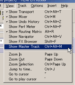 マスターというのは「各トラックの音を混ぜて(ミックスして)からまとめて調整する」ための特殊なトラックで、画面左下にMASTERという名前で表示されているのがそれ。再生ボタンを押したときやマスターの書き出しを行ったときはここから音が出る(とくに設定しない限り各トラックが勝手に音を出すことはない、というか、デフォルトではマスターだけがスピーカにつながっている:真中あたりにある「マスターとは別に直接出力」を使うと、勝手に音を出すこともできる)。こうやって「音の行き先を設定すること」を「ルーティング」という。活用例は録音と加工のページを参照。