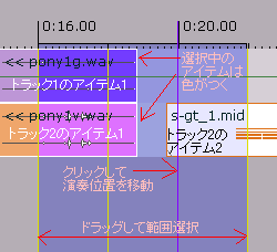 アイテムをクリックすると選択(複数可)、ドラッグすると上下左右に移動できるほか、Ctrlを押しながら動かすとコピー、アイテムの右端ドラッグで打ち切りとループ、Altを押しながらアイテムの右端ドラッグでタイムストレッチ(音程を変えない引き伸ばしと短縮)などができる。また、トラックがないところにアイテムを持っていくと、勝手にトラックが新規作成される(Ctrl+Tなどで手動作成も可能)。