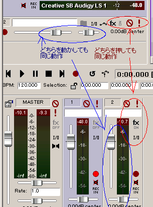 トラック番号のところをクリックするとトラックを選択できるが、CtrlキーやShiftキーを押しながらクリックすることで複数のトラックをいちどに選択できる。音量やPANなどのフェーダー(ツマミ)は、Ctrlキーを押しながらドラッグすると細かく動かすことが可能で、ダブルクリックするとプラマイゼロに戻る。